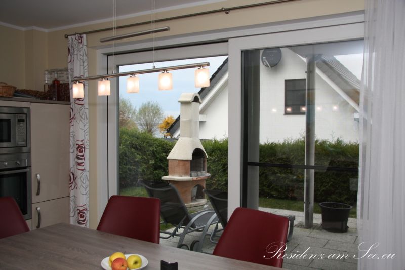 Der Essbereich verfügt über einen Tisch und Sitzgelegenheiten für 6 Personen und grenzt an die voll ausgestattete Küche an. Von hier können Sie bereits einen ersten kleinen Blick auf den See werfen.