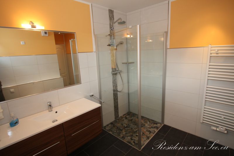 Auf der anderen Seite des Flures befindet sich das erste von zwei Badezimmern. Dieses ist großzügig gestaltet, verfügt über eine ebenerdige Dusche, über Waschbecken, Toilette, Spiegel und Föhn. Eben alles was ein Bad ausmacht.