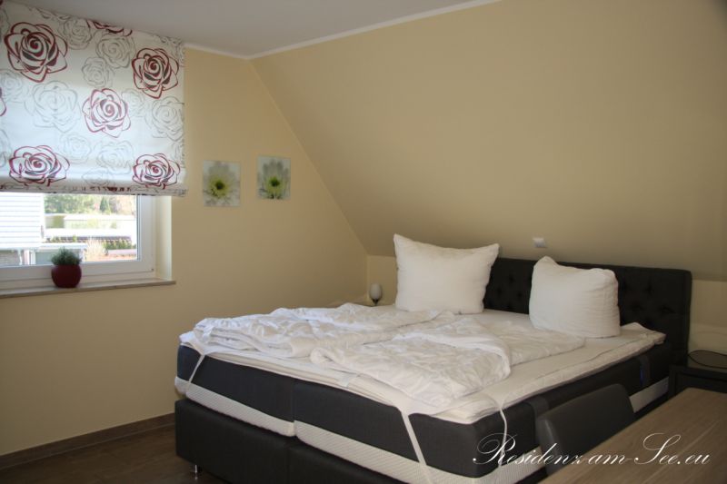 Vom Flur geht es zum einen ab in das erste Schlafzimmer. Dieses ist, wie alle anderen Schlafzimmer auch, ausgestattet mit einem Boxspringbett (180 cm x 200 cm), einem großen Kleiderschrank, Fernseher sowie einem kleinen Tisch mit Stuhl.