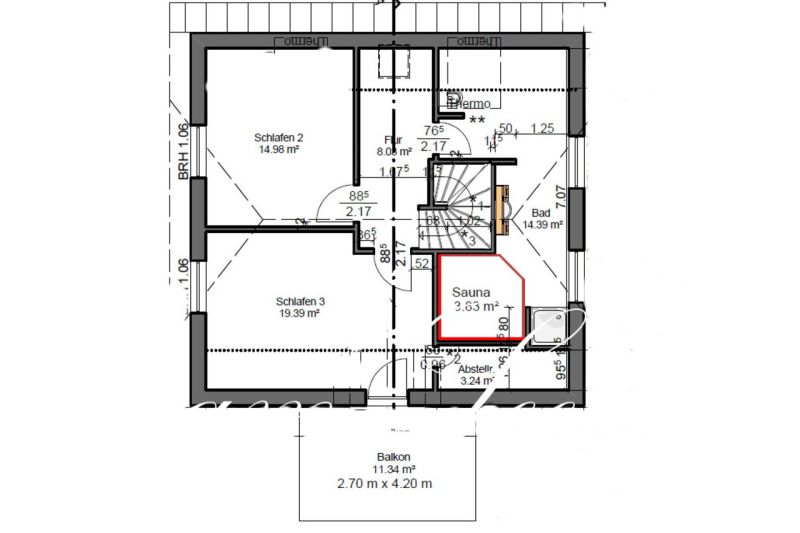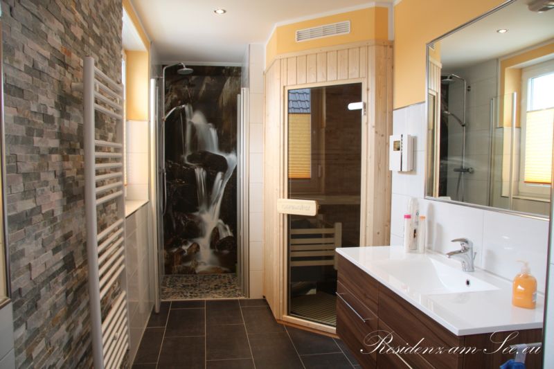 Auch das Bad in der oberen Etage kann sich sehen lassen und verdient durch seine Ausstattung eher den Namen Wellnessbereich. Hier befinden sich zu der Grundausstattung (Waschbecken, Dusche, Toilette, Föhn, Spiegel) zusätzlich noch eine finnische Holz-Sauna sowie eine großzügige Eck-Badewanne.